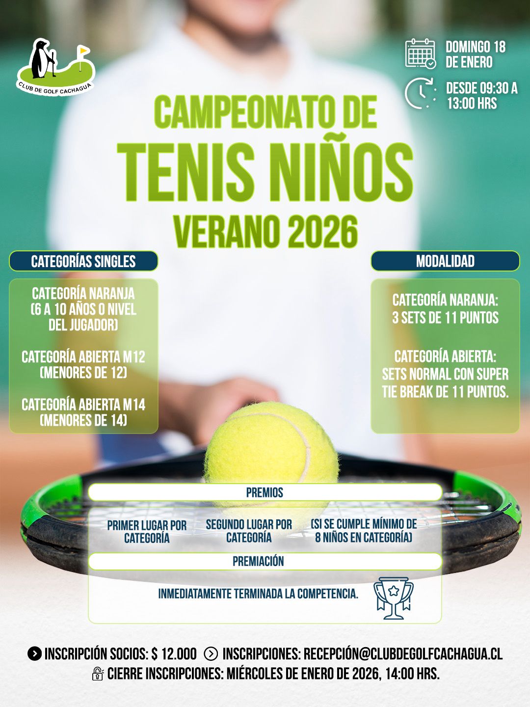 También queremos invitar a los jóvenes tenistas a participar en el Campeonato de Tenis Niños Verano 2026 que se jugará el domingo 18 de enero. El torneo contempla las categorías singles Naranja (de 6 a 10 años o por nivel del jugador), Abierta M12 (menores de 12) y Abierta M14 (menores de 14).